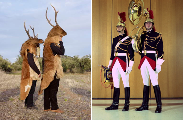 Mark Twain once said that “Clothes make the man. Naked people have little or no influence on society.” While the characters of “Légionnaires” have a fixed place in the social realm, it is clear that without then uniforms and accessories they are left naked and powerless in society, having only their bodies to contend with. Similarly, we cannot forget that the wild beings of “Wilder Mann” are really just men hidden beneath elaborate costumes really no different from a uniform.