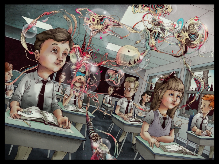 The personal expression of creativity and individualism that Perry encourages is shown as an anomaly in “Disturbance.” A lone student’s mind explodes into a chaotic, plasmic mess above the ardent, intact heads of his fellow students, its colourful debris erupting through a room rooted in heightened conformity and rigid formalities. This is an expression that isn’t appreciated or encouraged by the authority of the room, perceived instead as the artwork’s very title declares – a disrupting, unwanted “Disturbance.”