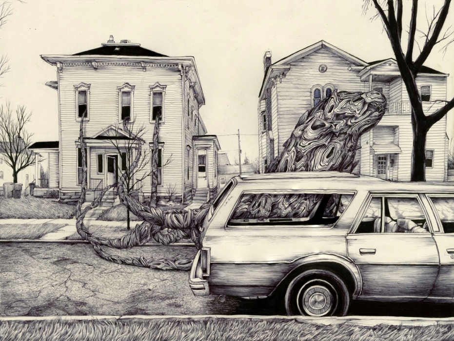 Rather than limiting his creative expertise to the visual arts, Pat Perry flourishes too as an intrepid traveller, prolific storyteller and, at times, a disaffected youth and romantic philosophiser. His tales of hopping freight trains and hitching rides with lonely truckers across the American planes are reminiscent of those told by the Beat and Hippie counter-cultures folk. Motorbike rallies with his “gang of goons”conjure up images of blighted, leather-clad biker crews rebelling against the system. His solitary, reflective hies across the Alaskan wilderness capture something of the nature idolising Romantic-era. While he is currently working on compiling these stories into a novel, they have already been documented via the intricate detail of his pencil and are available to pore over on his portfolio.
