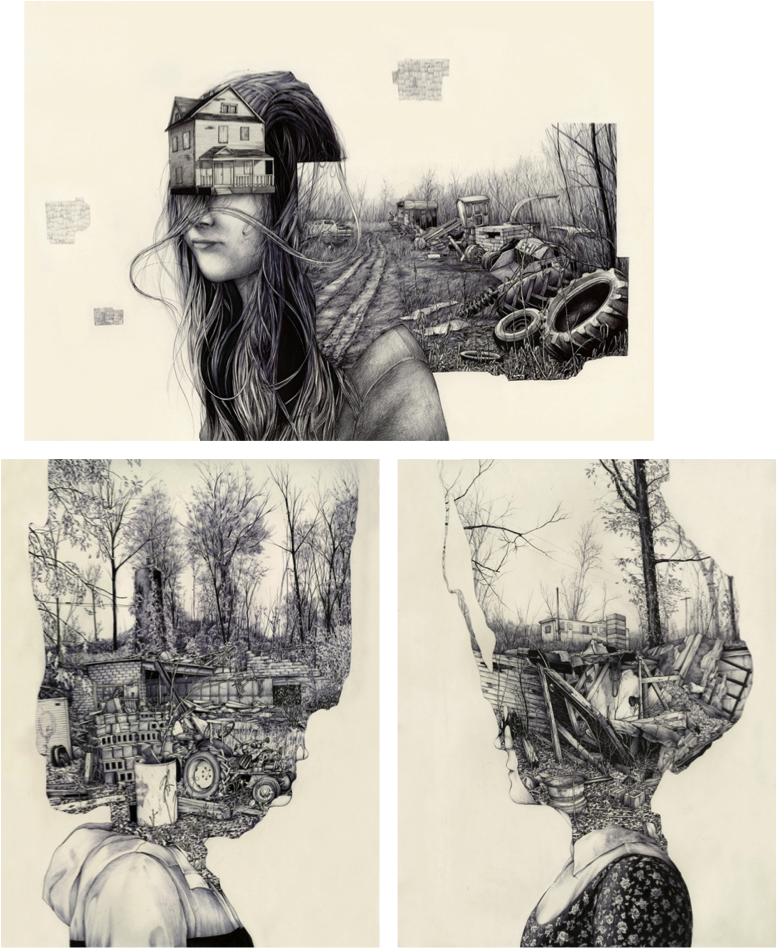 In the first, a young girl’s childhood home and the life enclosed within its sturdy walls, takes the place of her eyes and mind. Having been the only life she has yet experienced, it makes up who she is at that time. Yet, the opportunity to move beyond this and explore lingers on the periphery. Tyre tracks stretch away into the distance, littered with broken car parts, tractor pieces, discarded tyres, bricks, all urging her to keep moving, never to stop and become caught up in the stale banality that comes with settling. In “Outlived,” this degradation at the side of the road has taken over, engulfing the figures entirely in a powerful representation of lost opportunity. Roots and weeds clamber over everything, while piles of bricks and collapsed timber hint at something unfinished, forgotten. The opportunity still lingers, faintly, in the form of a decrepit tractor, long forgotten, but repairable.