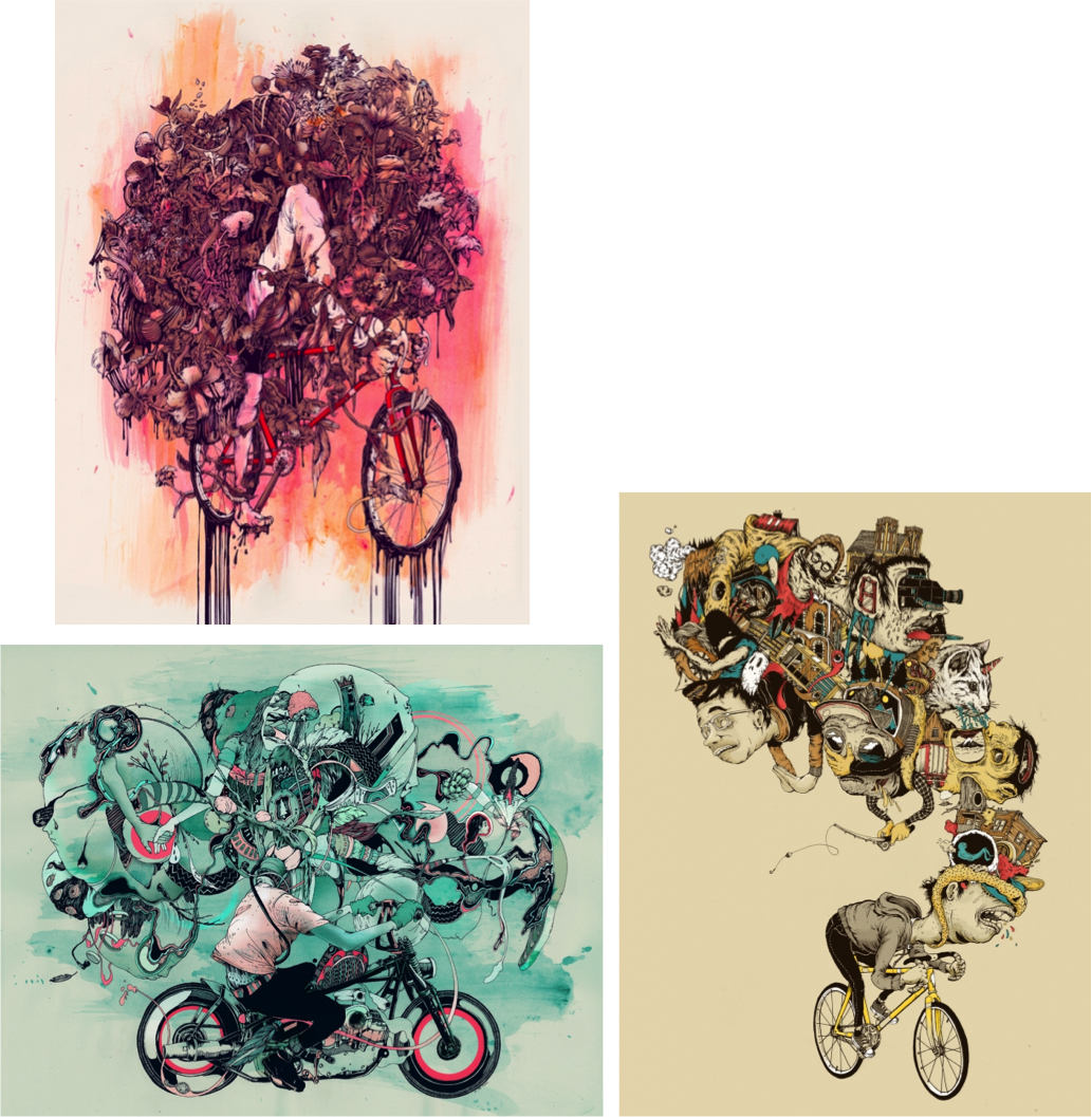 Perry’s drawings of various figures, struggling and toiling on their bikes, are shown to be physically weighted down by the masses of memories and emotions that are churned involuntarily from their minds. The little home that sits so innocently at the forefront of our existence, proves to be a heavy load.