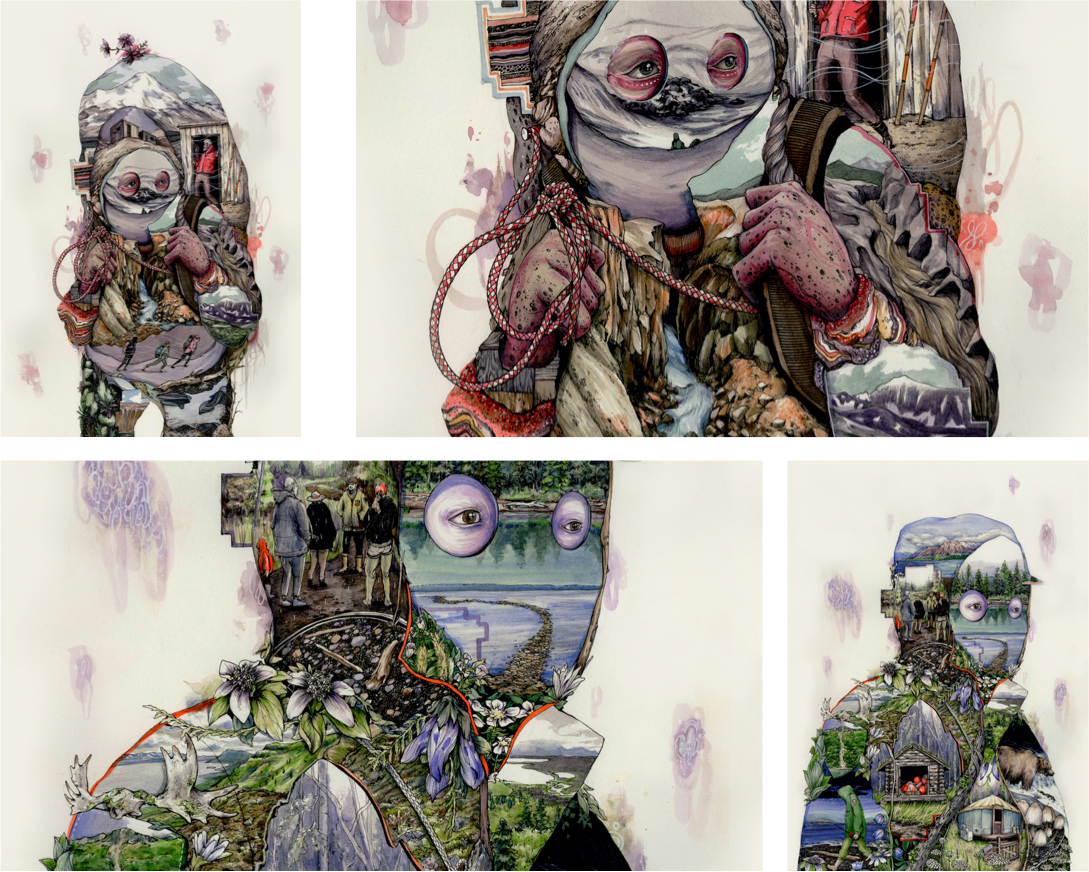 The artist documents some of his own personal explorations and travels in his Alaska series, a collection of nature inspired sketches, paintings and photographs. In some, the surrounding nature infiltrates the characters entirely, filling them until they seem to embody the wilderness themselves. Others show people climbing, burrowing and contemplating the landscapes around them. Getting lost in the wild arbitrary state of nature is perhaps part of the experience of self discovery, removing oneself entirely from the structure of society and its conventions. Henry Thoreau, in his retreat to Walden woods, certainly believed this: