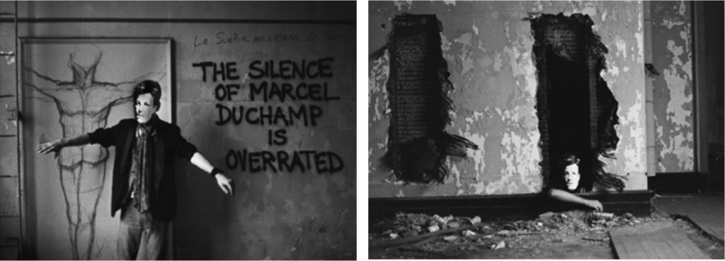 In his series Arthur Rimbaud in New York, David Wojnarowiczphotographs a figure wearing a Rimbaud mask in various sordid waterfront sites as he physically adjusts the landscape around him. The frameworks of a previously secure, official space are now easily manipulated to accommodate this nonconforming, gay figure of Rimbaud, with whom Wojnarowicz identified. The initial dominancy of convention is revealed as delicate and transitory.