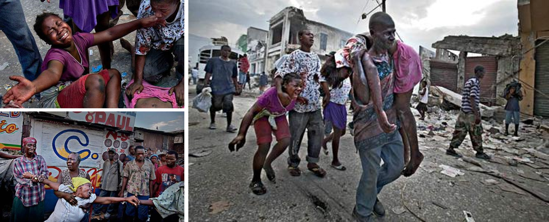 Hensen’s image focuses entirely on Fabienne, while two looters nearby are side-lined almost insignificantly to the periphery of the frame. Oleniuk attributes more of the focus to the looters, causing the viewer to be shocked simultaneously by both the tragedy and the apparent indifference of those around her. Weber’s contribution adds an entirely unwelcome element of truth while without the photographers’ various images of Fabienne’s mourning family, the insurmountable grief and sorrow of the situation would not have been documented.