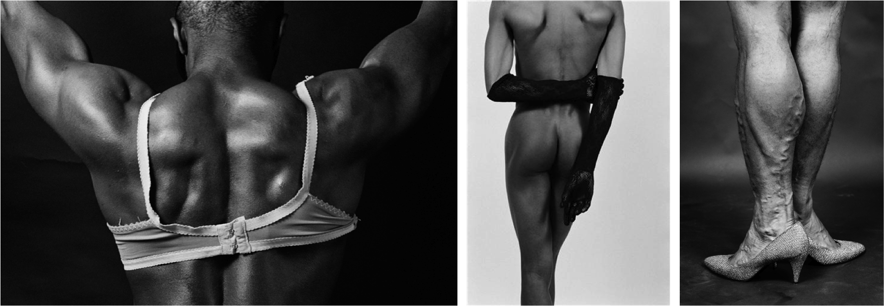 Blurring the lines between socially established dichotomies, Ajamu disrupts what is considered “normal” with regards to sexuality and desire. His placement of “feminine” props and attire against the naked male body seeks to distort fixed gender notions. Here, the transgender politics of Patrick Califia are aroused, who questioned the possibility of being “both male and female,” to ”create an individual synthesis of gender expression that is a path between these dichotomies.”  Through this visual reconsidering of external, socially enforced gender symbols, the viewer is invited to similarly reassess internal gender stereotypes, such as “tenderness” and “toughness.” In the same way, Ajamu reevaluates ideas of sexual dominance and submissiveness, interlacing images of black male intimacy and affection with those of erotically charged expression of desire.
