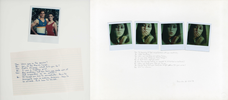 His series He/She, presents a selection of images of himself and friends that play on the idea of the Polaroid as the “bedroom camera.” Beneath, short lines of conversation are scrawled in pencil. Handwritten, they heighten the candid, personal feel, as though offering an insight into these intimate interactions. Yet the texts are entirely fabricated by Heinecken himself, fiction in autobiographical guise.