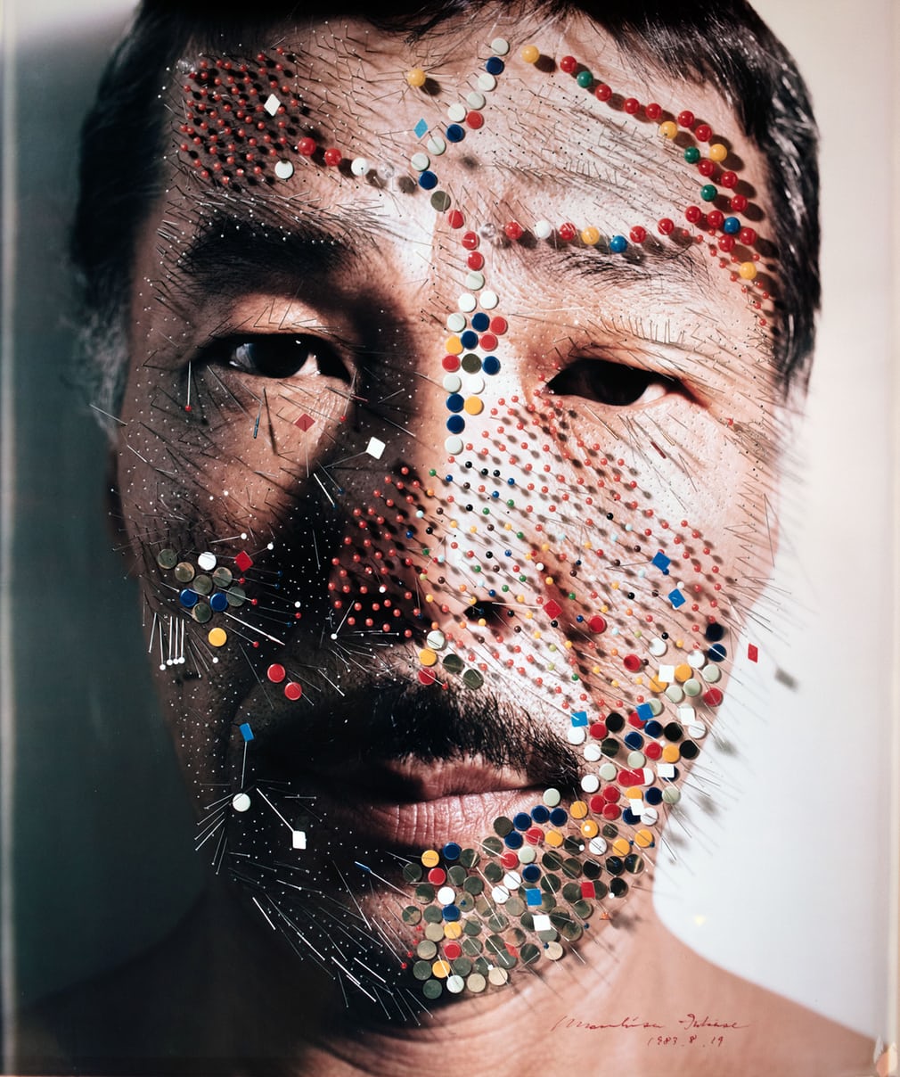 As Japan rode the final leg of its post-war consumer boom, the point of Fukase’s needle pushed through the taut surface of his cheekbone, printed onto matte-coated, ultrasmooth art paper. Millions of urban dwellers were embroiled heedlessly in the global purchasing of self-creation. Yet Fukase sat inside, undertaking a meticulous act of self-destruction. Surveying his papery face with coloured pins and points – just as one might tack a hastily scribbled reminder to a cork board, or pin down a coveted destination on a map.