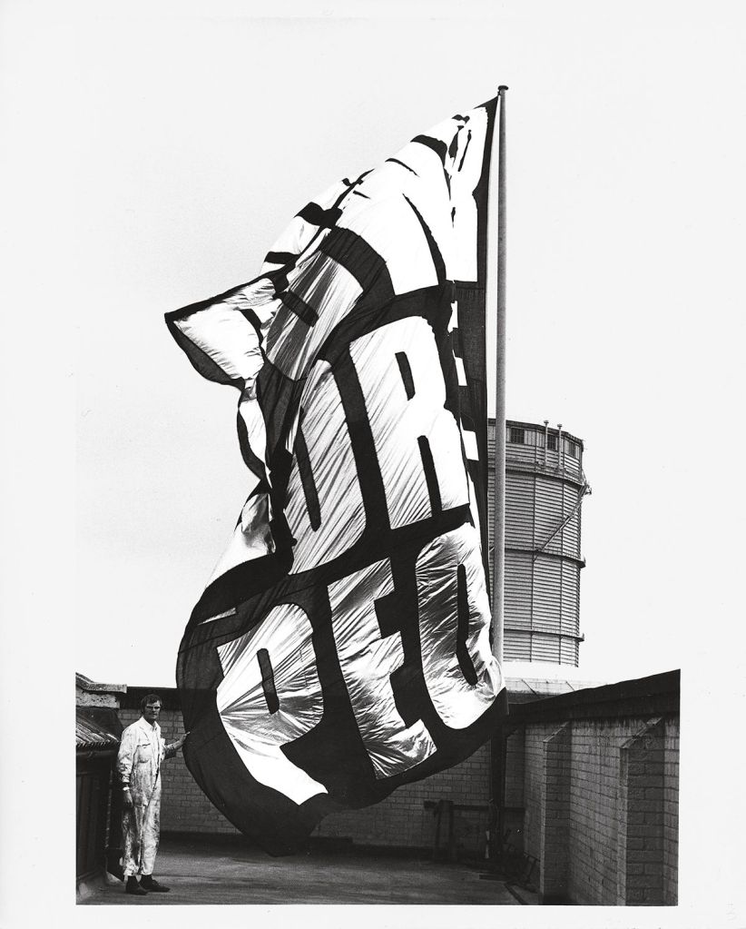 At the centre of the action, in 1972, Rose Finn-Kelcey’s public art display appeared suddenly against the station’s clay brick walls; large black flags billowing in the wind, broadcasting the slogan Power for the People across the rooftops. This work was part of a series of flags Finn-Kelcey created and displayed from the top of various European landmarks between 1968-73. Drawing on the kinetic art tradition of the previous decade, Finn-Kelcey named the flags ‘wind-blown objects,” for without the motion of the wind propelling them they could do little but hang limply, their messages hidden inside folds of fabric.
