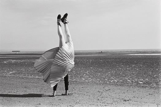 In The Restless Image: a discrepancy between the felt position and the seen position, Finn-Kelcey morphs the female body from its recognisable form, capturing a moment of thrilling, bewildering, youthful experience. Here, on the sands of Greatstone beach in Kent, she poses in a handstand, her face obscured by the billowing pleats of her skirt which falls around in a conch-like form. From the centre of this almost labial opening, her legs and arms grow out from either side albeit in reverse. Hands root her to the steady ground, feet stretch up and away from the known, out into the unpredictable world beyond where all known reference points, such as ‘up’ and ‘down,’ seem to have lost their relevance.