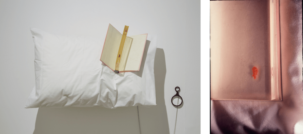 Finn-Kelcey seems to embrace this contradictory nature of experience and self, her works filled with moments of self-expressions in opposition to one another. In Book and Pillow, she gives form to the most anxious and unimpressive side of herself through a model of a small homunculus; a tiny pink critter, feeble and folded yet always lingering, always following her, from the heart of her work to the depths of her dreams and subconscious.Placed within the pages of a book balanced on a pillow, viewers are invited to hone in on this hidden, private, vulnerable side of the artist through a magnifying glass which, when picked up off the wall, activates the incessant sound of a buzzing fly.