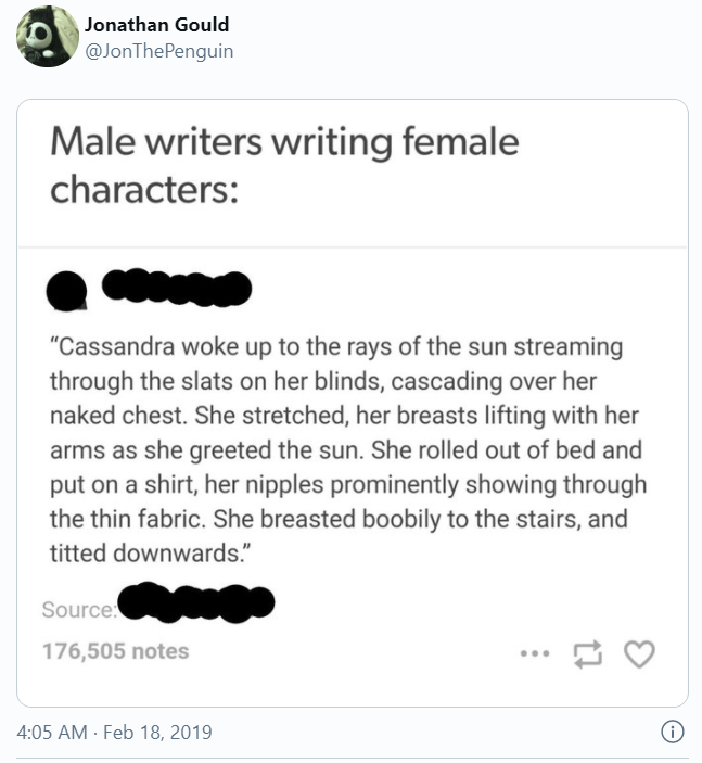 And anyway, perhaps not all male writers are as openly frank about their obsession with breasts (although that’s only a ‘perhaps’):